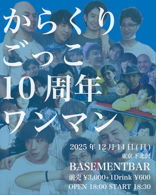 からくりごっこ 10周年 ワンマン イベント詳細 日付: 2025年12月14日 18:00 – 23:00 カテゴリ: sunday 2025年12月14日(日) ACT からくりごっこ OPEN18:00/START18:30 ADV¥3,000-/DOOR¥3,500-(+1Drink ¥600-) 【 チケット予約 】 からくりごっこ 10周年 ワンマン メールでのチケット予約はこちらからMAIL