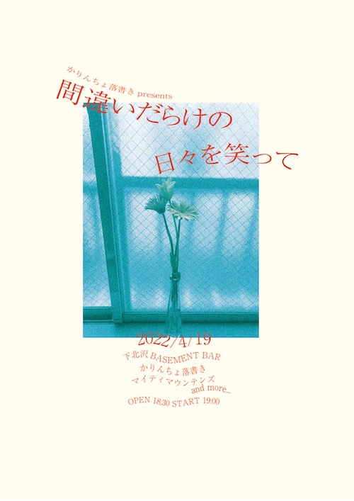 間違いだらけの日々を笑って イベント詳細 日付: 2022年4月19日 18:30 – 23:00 2022年4月19日(火) 間違いだらけの日々を笑って OPEN18:30/START19:00 ADV¥2,000-(+1D) ACT かりんちょ落書き マイティマウンテンズ and more… メールでのチケット予約はこちらからMAIL 友達にページをシェア フォローする MAIL