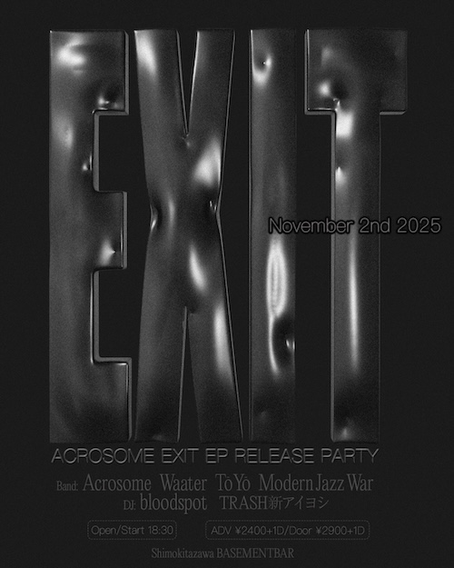 Acrosome Exit ep Release Party イベント詳細 日付: 2025年11月2日 18:30 – 23:00 カテゴリ: sunday 2025年11月2日(日) BAND Acrosome Waater Tō Yō Modern Jazz War DJ bloodspot TRASH新アイヨシ OPEN & START18:30 ADV¥2,400-/DOOR¥2,900-(+1Drink ¥600-) Acrosome Exit ep Release Party メールでのチケット予約はこちらからMAIL 友達にページをシェア フォローする MAIL