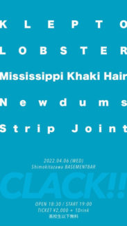 CLACK!! イベント詳細 日付: 2022年4月6日 18:30 – 23:00 2022年4月6日(水) CLACK!! OPEN18:30/START19:00 ADV¥2,000-(+1D) ACT KLEPTO LOBSTER Mississippi Khaki Hair Newdums メールでのチケット予約はこちらからMAIL 友達にページをシェア フォローする MAIL