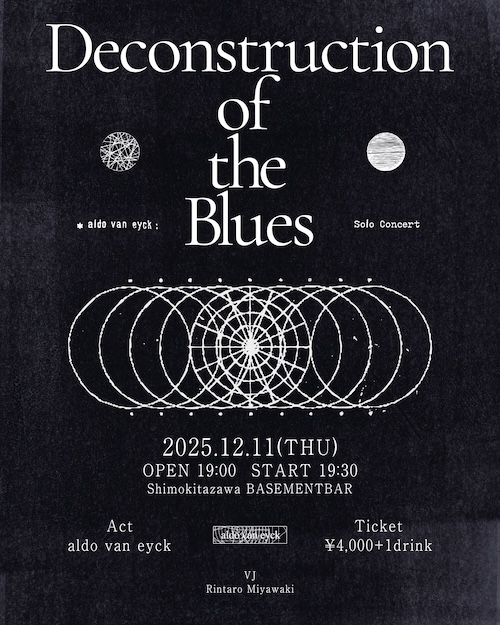 Deconstruction of the Blues イベント詳細 日付: 2025年12月11日 19:00 – 23:00 カテゴリ: weekdays 2025年12月11日(木) ACT aldo van eyck VJ Rintaro Miyawaki OPEN19:00/START19:30 TICKET¥4,000-(+1Drink ¥600-) 【 チケット予約 】 aldo van eyck ONE-MAN LIVE Deconstruction of the Blues メールでのチケット予約はこちらからMAIL