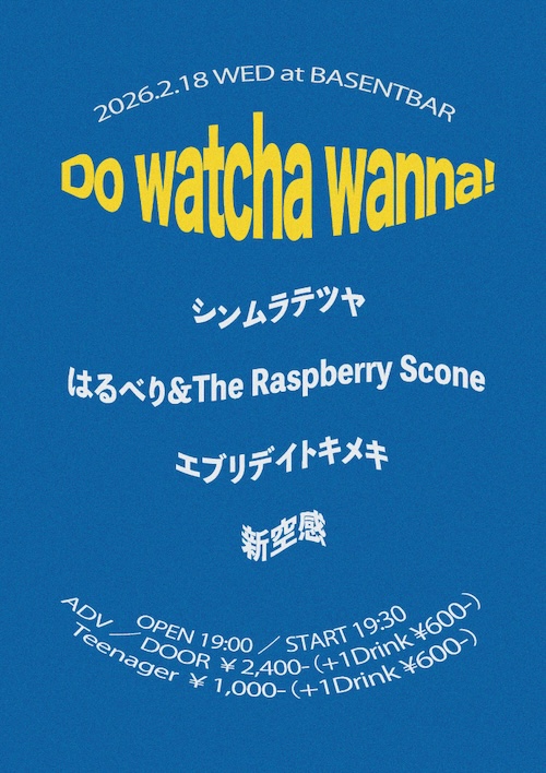 Do watcha wanna! イベント詳細 日付: 2026年2月18日 19:00 – 23:00 カテゴリ: weekdays 2026年2月18日(水) ACT シンムラテツヤ はるべり&The Raspberry Scone エブリデイトキメキ 新空感 OPEN19:00/START19:30 ADV & DOOR¥2,400-(+1Drink ¥600-) Teenager¥1,000-(+1Drink ¥600-) Do watcha wanna! メールでのチケット予約はこちらからMAIL 友達にページをシェア フォローする MAIL