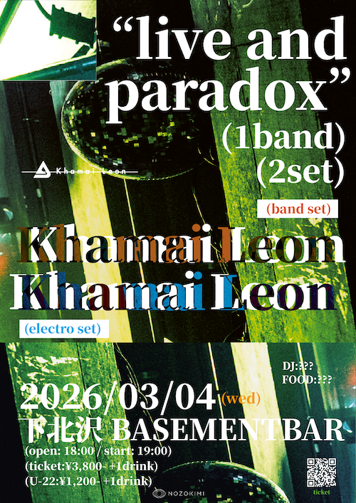 live and paradox イベント詳細 日付: 2026年3月4日 18:00 – 23:00 カテゴリ: weekdays 2026年3月4日(水) ACT Khamai Leon(live:バンド編成) Khamai Leon(paradox:エレクトロ編成) DJ ?? FOOD ?? OPEN18:00/START18:30 ADV¥3,800-(+1Drink ¥600-) U-22¥1,200-(+1Drink ¥600-) 【 チケット予約 】 live and paradox メールでのチケット予約はこちらからMAIL
