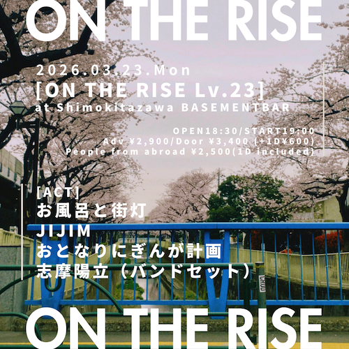 ON THE RISE Lv.23 イベント詳細 日付: 2026年3月23日 18:30 – 23:00 カテゴリ: weekdays 2026年3月23日(月) ACT お風呂と街灯 JIJIM おとなりにぎんが計画 志摩陽立(バンドセット) OPEN18:30/START19:00 ADV¥2,900-/DOOR¥3,400-(+1Drink ¥600-) PEOPLE FROM ABROAD¥2,500-(1Drink included) ON THE RISE Lv.23 メールでのチケット予約はこちらからMAIL 友達にページをシェア フォローする MAIL