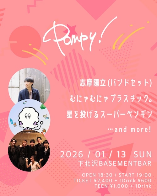 Pompy! イベント詳細 日付: 2026年1月13日 18:30 – 23:00 カテゴリ: weekdays 2026年1月13日(火) ACT 志摩陽立(バンドセット) むにゃむにゃプラスチック。 星を投げるスーパーペンギン OPEN18:30/START19:00 TICKET¥2,400-(+1Drink ¥600-) TEEN¥1,000-(+1Drink ¥600-) Pompy! メールでのチケット予約はこちらからMAIL 友達にページをシェア フォローする MAIL
