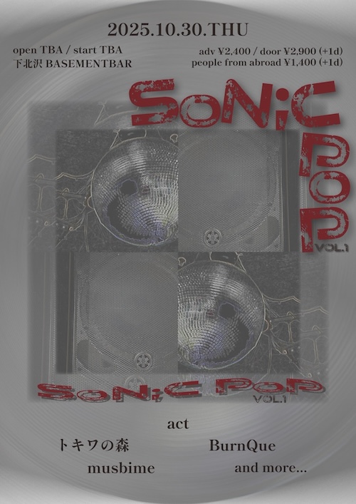 SoNiC PoP vol.1 イベント詳細 日付: 2025年10月30日 18:00 – 23:59 カテゴリ: weekdays 2025年10月30日(木) ACT トキワの森 BurnQue musbime and more… OPENTBA/STARTTBA ADV¥2,400-/DOOR¥2,900-(+1Drink ¥600-) PEOPLE FROM ABROAD¥1,400-(+1Drink ¥600-) SoNiC PoP vol.1 メールでのチケット予約はこちらからMAIL 友達にページをシェア フォローする MAIL