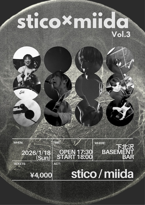 stico×miida vol.3 イベント詳細 日付: 2026年1月18日 17:30 – 23:00 カテゴリ: sunday 2026年1月18日(日) ACT miida stico OPEN17:30/START18:00 TICKET¥4,000-(+1Drink ¥600-) 【 チケット予約 】 stico×miida vol.3 メールでのチケット予約はこちらからMAIL