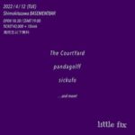 Little fix 2022年4月12日 18:30 – 23:00 2022年4月12日(火) Little fix OPEN18:30/START19:00 ADV¥2,000-(+1D)/高校生以下無料 ACT The CourtYard pandagolff sickufo