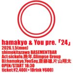 24 2026年1月5日 18:30 – 23:00 カテゴリ: weekdays 2026年1月5日(月) ACT sickufo 晩年 Glimpse Group DJ hamakyo YouSay 斎藤雄 片山翔太 OPEN & START18:30 TICKET¥2,400-(+1Drink ¥…
