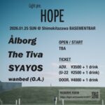 HOPE 2026年1月25日 18:00 – 23:00 カテゴリ: sunday 2026年1月25日(日) ACT Ålborg THE ティバ SYAYOS wanbed (O.A.) OPENTBA/STARTTBA ADV¥3,500-/DOOR¥4,000-(+1Drink ¥600-) U…