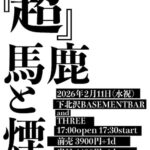 『超』馬鹿と煙 2026年2月11日 17:00 – 23:00 カテゴリ: holiday 2026年2月11日(水・祝) ACT videobrother 生音バンド Pinch of Snuff 紫ベビードール Pessor P.Peseta CABALLERO POLKERS ミートザホープス OPEN1…