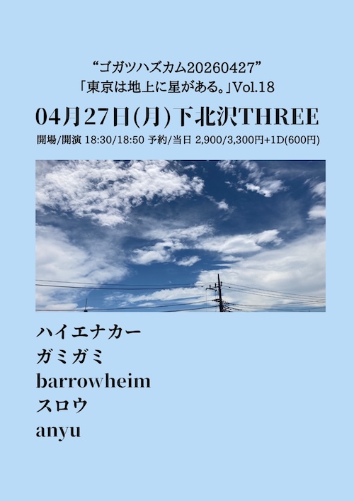 「東京は地上に星がある。」Vol.18 イベント詳細 日付: 2026年4月27日 18:30 – 23:00 カテゴリ: 平日 2026年4月27日(月) ACT ハイエナカー ガミガミ barrowheim スロウ anyu OPEN18:30/START18:50 ADV¥2,900-/DOOR¥3,300-(+1Drink ¥600-) 【 チケット予約 】 “ゴガツハズカム20260427” 「東京は地上に星がある。」Vol.18 メールでのチケット予約はこちらからMAIL