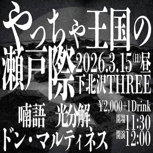 やっちゃ王国の瀬戸際 イベント詳細 日付: 2026年3月15日 11:30 – 23:00 カテゴリ: 日曜 / 祝日 2026年3月15日(日)お昼の公演 ACT 喃語 ドン・マルティネス 光分解 OPEN11:30/START12:00 ADV & DOOR¥2,000-(+1Drink ¥600-) やっちゃ王国の瀬戸際 メールでのチケット予約はこちらからMAIL 友達にページをシェア フォローする?