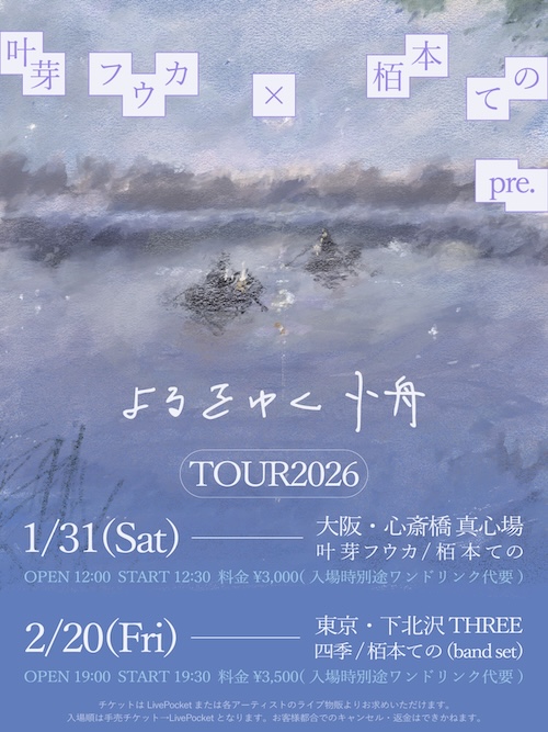 よるをゆく小舟 TOUR2026 イベント詳細 日付: 2026年2月20日 19:00 – 23:00 カテゴリ: 平日 2025年2月10日(金) ACT 四季 栢本ての(band set) OPEN19:00/START19:30 ADV¥3,500-(+1Drink ¥600-) 【 チケット予約 】 入場は手売りチケット→Livepocketの順番となります。 叶芽フウカ×栢本ての pre. よるをゆく小舟 TOUR2026 メールでのチケット予約はこちらからMAIL