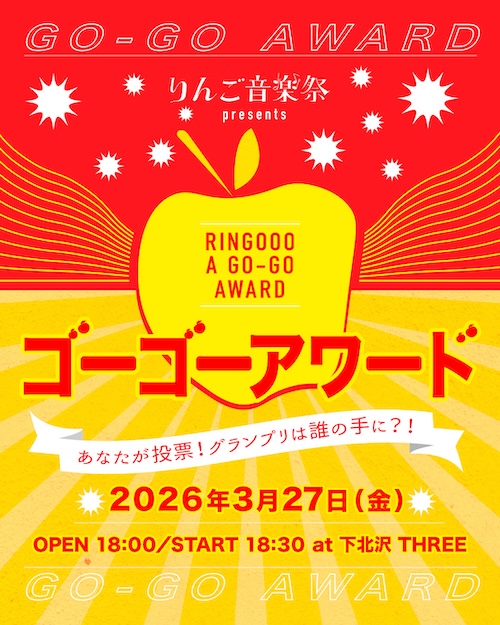 この度、2026年の「RINGOOO A GO-GO」グランプリを決める「ゴーゴーアワード」を3月27日(金)に下北沢THREEにて開催します。当日は、音楽祭関係者の投票によって選ばれた6組がライブ出演し、グランプリは来場者の皆さまによる投票で決定いたします。さらに、多種多様な音楽祭関係者より当日のライブを観た上で特別賞が贈呈されます。ぜひご来場いただき、あなたの一票を投票してください!