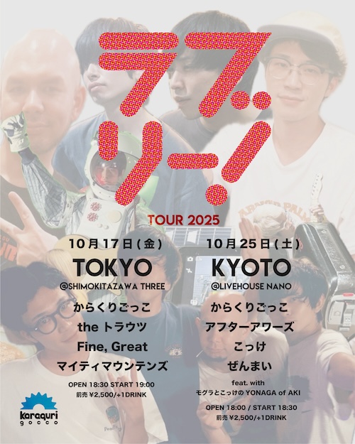 ラブリー!ツアー東京編 イベント詳細 日付: 2025年10月17日 18:30 – 23:00 カテゴリ: 平日 2025年10月17日(金) ACT からくりごっこ the トラウツ Fine, Great マイティマウンテンズ OPEN18:30/START19:00 ADV¥2,500-/DOOR¥3,000-(+1Drink ¥600-) からくりごっこ pre. ラブリー!ツアー東京編 メールでのチケット予約はこちらからMAIL 友達にページをシェア フォローする?