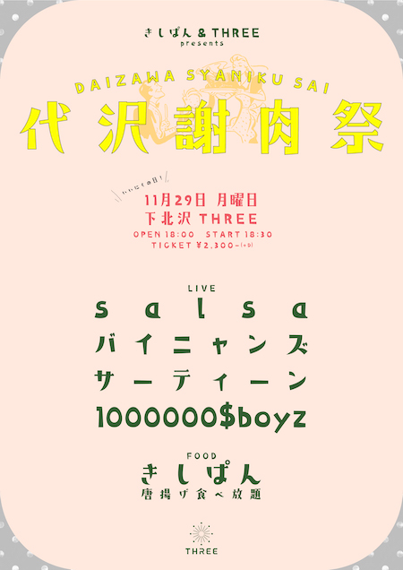 代沢謝肉祭 イベント詳細 日付: 2021年11月29日 18:00 – 22:30 カテゴリ: 平日 2021年11月29日(月) きしぱん×THREE企画 代沢謝肉祭 OPEN18:00/START18:30 Charge¥2,300-(+1D) ACT バイニャンズ salsa サーティーン 1000000$boyz FOOD きしぱん(唐揚げ食べ放題) メールでのチケット予約はこちらからMAIL 友達にページをシェア フォローする?