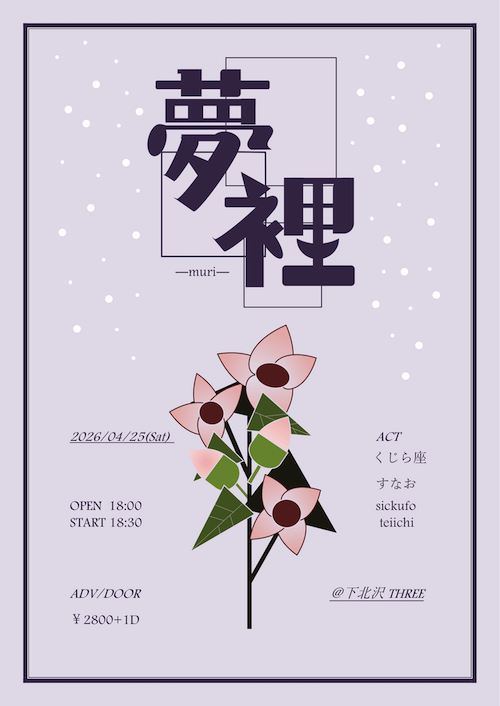 夢裡 イベント詳細 日付: 2026年4月25日 18:00 – 23:00 カテゴリ: 土曜日 2026年4月25日(土) ACT くじら座 すなお sickufo teiichi OPEN18:00/START18:30 TICKET¥2,800-(+1Drink ¥600-) 夢裡 メールでのチケット予約はこちらからMAIL 友達にページをシェア フォローする?