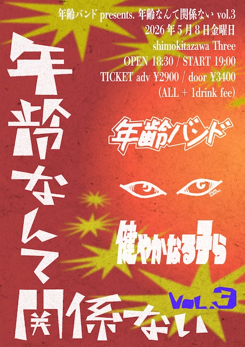 年齢なんて関係ない vol.3 イベント詳細 日付: 2026年5月8日 18:30 – 23:00 カテゴリ: 平日 2026年5月8日(金) ACT 年齢バンド DNA GAINZ 健やかなる子ら OPEN18:30/START19:00 ADV¥2,900-/DOOR¥3,400-(+1Drink ¥600-) 【 チケット予約 】 年齢なんて関係ない vol.3 メールでのチケット予約はこちらからMAIL