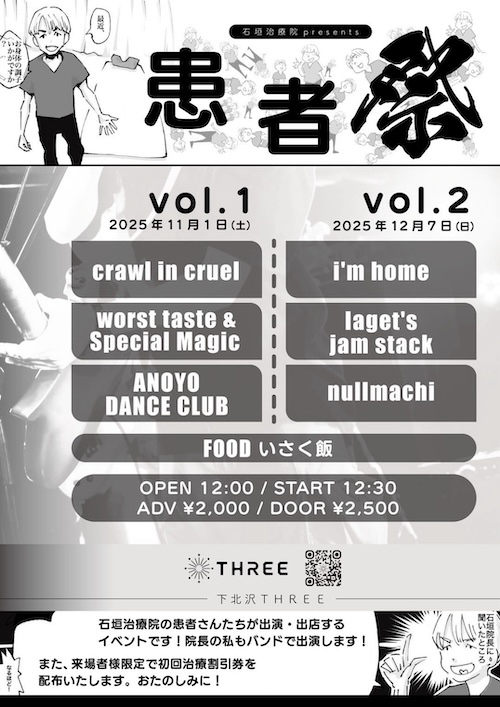 患者祭 vol.1 イベント詳細 日付: 2025年11月1日 12:00 – 15:00 カテゴリ: お昼 2025年11月1日(土)お昼 ACT crawl in cruel worst taste&Special Magic ANOYO DANCE CLUB FOOD いさく飯 OPEN12:00/START12:30 ADV¥2,000-/DOOR¥2,500-(+1Drink ¥600-) ※初回治療割引券配布します 【 チケット予約 】 石垣治療院 presents 患者祭 vol.1 メールでのチケット予約はこちらからMAIL