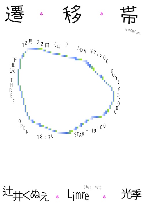 遷移帯 イベント詳細 日付: 2025年12月22日 18:30 – 23:00 カテゴリ: 平日 2025年12月22日(月) ACT 辻井くぬえ Limre 光季 OPEN18:30/START19:00 ADV¥2,500-/DOOR¥3,000-(+1Drink ¥600-) 【 チケット予約 】 辻井くぬえ pre. 遷移帯 メールでのチケット予約はこちらからMAIL