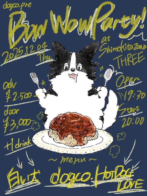 Bow Wow Party! イベント詳細 日付: 2025年12月4日 19:30 – 23:00 カテゴリ: 平日 2025年12月4日(木) ACT 白い犬 HOT DOG LOVE dogco. OPEN19:30/START20:00 ADV¥2,500-/DOOR¥3,000-(+1Drink ¥600-) dogco. pre Bow Wow Party! メールでのチケット予約はこちらからMAIL 友達にページをシェア フォローする?