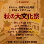 秋の大文化祭 2025年10月6日 19:30 – 23:00 カテゴリ: 平日 2025年10月6日(月) ACT カラバッシュ高等学校合唱部 DJ KAO a WASE DJ こっけ(THREE) あいたす(BAR BREAK) ハルキボーイ(BASEMENTBAR) テルミー(明大前Buttob…