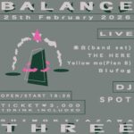 BALANCE 2026年2月25日 18:30 – 23:00 カテゴリ: 平日 2026年2月25日(水) ACT 来白(band set) Blufog THE HERE Yellow mo(Plan B) DJ SPOT OPEN & START18:30 TICKET¥3,000-(1DRIN…
