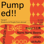 Pumped!! 2026年4月18日 18:00 – 23:00 カテゴリ: 土曜日 2026年4月18日(土) ACT おはよう三角 Nami Nami Beers JANO sickufo M.E.C. FOOD ISARIBI OPEN18:00/START18:30 ADV¥2,500-(+1Dr…