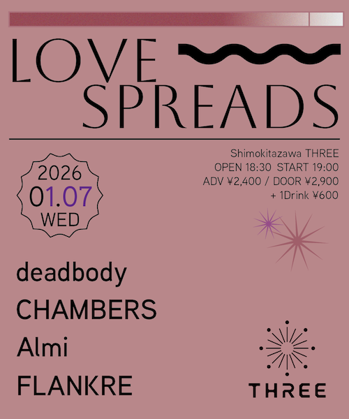 LOVE SPREADS イベント詳細 日付: 2026年1月7日 18:30 – 23:00 カテゴリ: 平日 2026年1月7日(水) ACT deadbody CHAMBERS Almi FLANKRE OPEN18:30/START19:00 ADV¥2,400-/DOOR¥2,900-(+1Drink ¥600-) LOVE SPREADS メールでのチケット予約はこちらからMAIL 友達にページをシェア フォローする?
