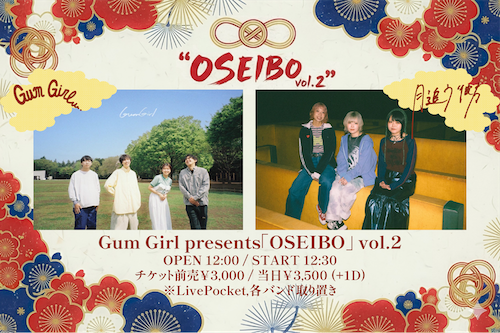 OSEIBO vol.2 イベント詳細 日付: 2025年12月13日 12:00 – 15:00 カテゴリ: お昼 2025年12月13日(土) ACT Gum Girl 月追う彼方 OPEN12:00/START12:30 ADV¥3,000-/DOOR¥3,500-(+1Drink ¥600-) 【 チケット予約 】 Gum Girl presents OSEIBO vol.2 メールでのチケット予約はこちらからMAIL