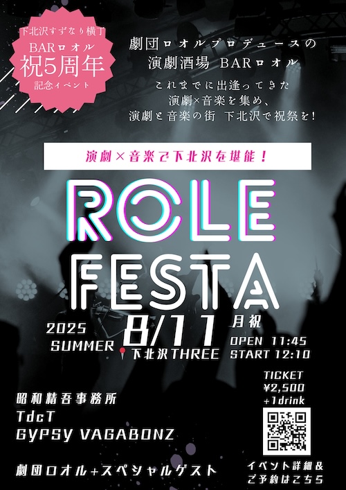 ROLE FESTA イベント詳細 日付: 2025年8月11日 11:45 – 15:00 カテゴリ: お昼 2025年8月11日(月・祝) BARロオル5周年記念イベント ROLE FESTA OPEN11:45/START12:10 ADV¥2,500-/DOOR¥3,000-(+1Drink ¥600-) イベント詳細URL ACT 昭和精吾事務所 TdcT GYPSY VAGABONZ 劇団ロオル+スペシャルゲスト メールでのチケット予約はこちらからMAIL