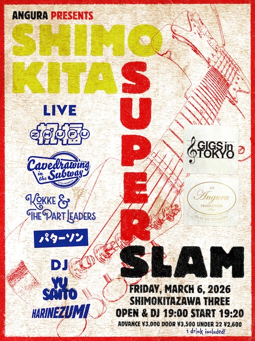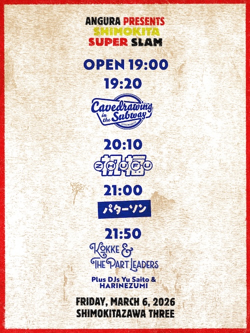 SHIMOKITA SUPER SLAM イベント詳細 日付: 2026年3月6日 19:00 – 23:00 カテゴリ: 平日 2026年3月6日(金) ACT Cavedrawing in The Subway 祝福/ZHUFU こっけ&ザ・パートリーダーズ パターソン DJ 斎藤雄 HARINEZUMI OPEN19:00/START19:20 ADV¥3,000-/DOOR¥3,500-(1Drink included) U22¥2,600-(1Drink included) 【 チケット予約 】 ANGURA pre. SHIMOKITA SUPER SLAM メールでのチケット予約はこちらからMAIL