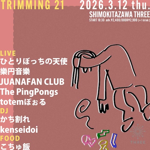 TRIMMING 21 イベント詳細 日付: 2026年3月12日 18:30 – 23:00 カテゴリ: 平日 2026年3月12日(木) ACT ひとりぼっちの天使 樂円音樂 JUANAFAN CLUB The PingPongs totemぽぉる DJ かち割れ kenseidoi FOOD こちゅ飯 OPEN & START18:30 ADV¥2,400-/DOOR¥2,900-(+1Drink ¥600-) TRIMMING 21 メールでのチケット予約はこちらからMAIL 友達にページをシェア フォローする?