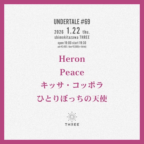 UNDERTALE #69 イベント詳細 日付: 2026年1月22日 19:00 – 23:00 カテゴリ: 平日 2026年1月22日(木) ACT Heron Peace キッサ・コッポラ ひとりぼっちの天使 OPEN19:00/START19:30 ADV¥2,400-/DOOR¥2,900-(+1Drink ¥600-) UNDERTALE #69 メールでのチケット予約はこちらからMAIL 友達にページをシェア フォローする?
