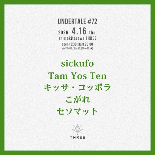 UNDERTALE #72 イベント詳細 日付: 2026年4月16日 19:30 – 23:00 カテゴリ: 平日 2026年4月16日(木) ACT sickufo Tam Yos Ten キッサ・コッポラ こがれ セソマット OPEN19:30/START20:00 ADV¥2,400-/DOOR¥2,900-(+1Drink ¥600-) UNDERTALE #72 メールでのチケット予約はこちらからMAIL 友達にページをシェア フォローする?