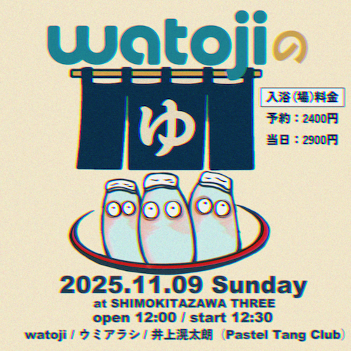 watojiの湯 イベント詳細 日付: 2025年11月9日 12:00 – 15:00 カテゴリ: お昼 2025年11月9日(日)お昼の公演 ACT watoji ウミアラシ 井上滉太郎(Pastel Tang Club) OPEN12:00/START12:30 ADV¥2,400-/DOOR¥2,900-(+1Drink ¥600-) watojiの湯 メールでのチケット予約はこちらからMAIL 友達にページをシェア フォローする?