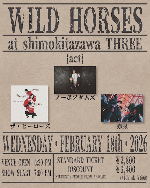 WILD HORSES イベント詳細 日付: 2026年2月18日 18:30 – 23:00 カテゴリ: 平日 2026年2月18日(水) ACT ノーボアダムズ 赤気 ザ・ヒーローズ OPEN18:30/START19:00 TICKET¥2,800-(+1Drink ¥600-) STUDENT / PEOPLE FROM ABROAD¥1,400-(+1Drink ¥600-) WILD HORSES メールでのチケット予約はこちらからMAIL 友達にページをシェア フォローする?