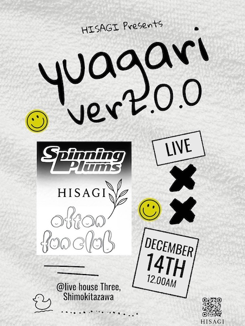 yuagari ver2.0.0 イベント詳細 日付: 2025年12月14日 12:00 – 15:00 カテゴリ: お昼 2025年12月14日(日) ACT HISAGI ofton fun club Spinning Plums OPEN12:00/START12:30 ADV¥2,600-(+1Drink ¥600-) HISAGI pre. music × art gallery yuagari ver2.0.0 メールでのチケット予約はこちらからMAIL 友達にページをシェア フォローする?